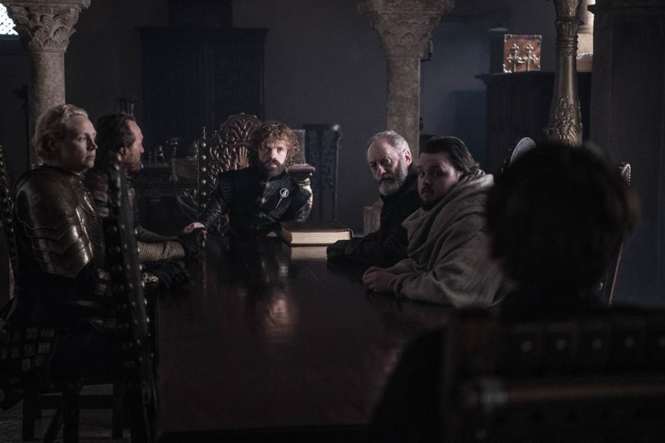- Tyrion은 Starks와 Davos(Liam Cunningham)와 함께 아주 작은 기사임에도 불구하고 항상 주변에 있기 때문에 귀족들 앞에 옵니다. Brienne of Tarth(Gwendoline Christie)와 성장한 Robin Arryn, 그리고 Edmure Tully(Tobias) Menzies)와 Sam Tarly(John Bradley), 그리고 이름이 한 번도 언급되지 않은 새로운 Dornish 왕자를 포함한 다양한 사람들. 왜 이 특정한 군중이 칠왕국의 운명을 결정하는지 잘 모르겠습니다. 결국 그들 중 일부는 대왕실의 대표자이지만 다른 일부는 더 큰 권력의 가신이 아닙니다. 나는 권력 공백이 책임이 있다고 생각합니다. 그리고 이러한 유형의 세부 사항은 한때 쇼에서 매우 중요했지만 더 이상 중요하지 않다는 사실입니다.
