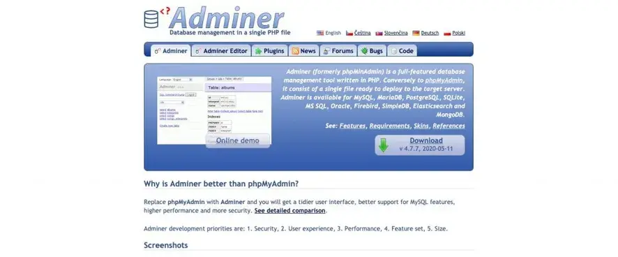- https://www.adminer.org/en/editor/ 링크에서 다운로드할 수 있습니다.