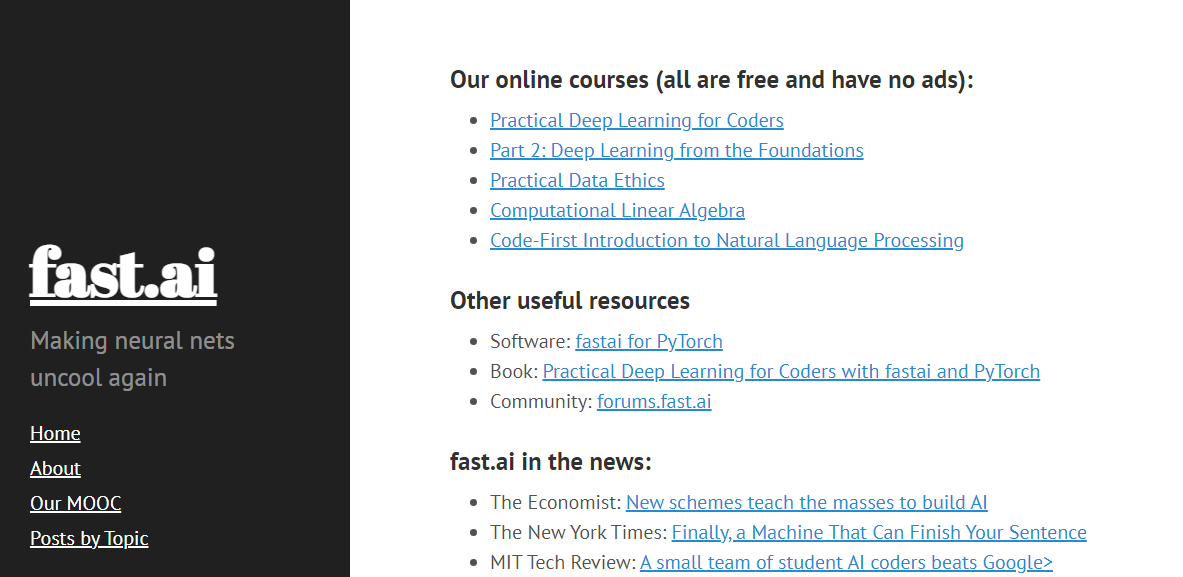 PyTorch를 기반으로 구축된 FastAi는 신경망을 만드는 데 사용됩니다. API의 일관성과 시각적 콘텐츠 및 텍스트에 대한 통합 지원 덕분에 FastAi는 최고의 라이브러리 중 하나이며 뛰어난 기능을 제공합니다.