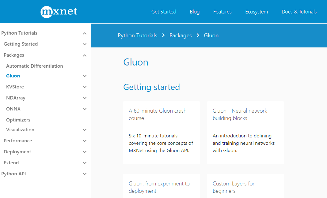 Apache MXNet에서 사용할 수 있는 Gluon은 Microsoft와 AWS에서 개발한 라이브러리입니다. Gluon을 사용하는 목적은 학습을 위한 정보가 풍부한 라이브러리를 갖는 것입니다. Gluon이 얼마나 직관적이고 일관성이 있는지를 고려하면 Gluon을 활용하는 방법을 배우는 데 너무 오래 걸리지 않아야 합니다.