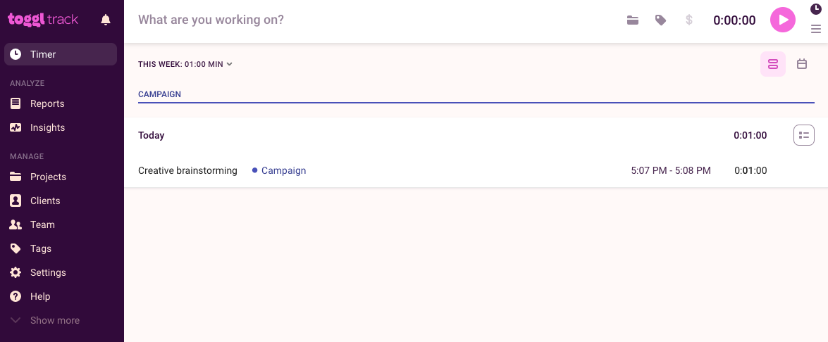 Toggl Track은 작업 타이밍을 시작할 때 많은 것을 묻지 않기 때문에 기본적으로 매우 쉽게 작동합니다. 많은 시간 추적 앱의 경우 앱에서 시간 추적을 허용하려면 먼저 클라이언트, 프로젝트 및 작업을 계정에 입력해야 합니다. 그렇지 않으면 당분간 작업을 제쳐두고 입력해야 합니다. Toggl Track을 사용하면 시간을 즉시 추적하고 나중에 세부 사항에 대해 걱정할 수 있습니다.