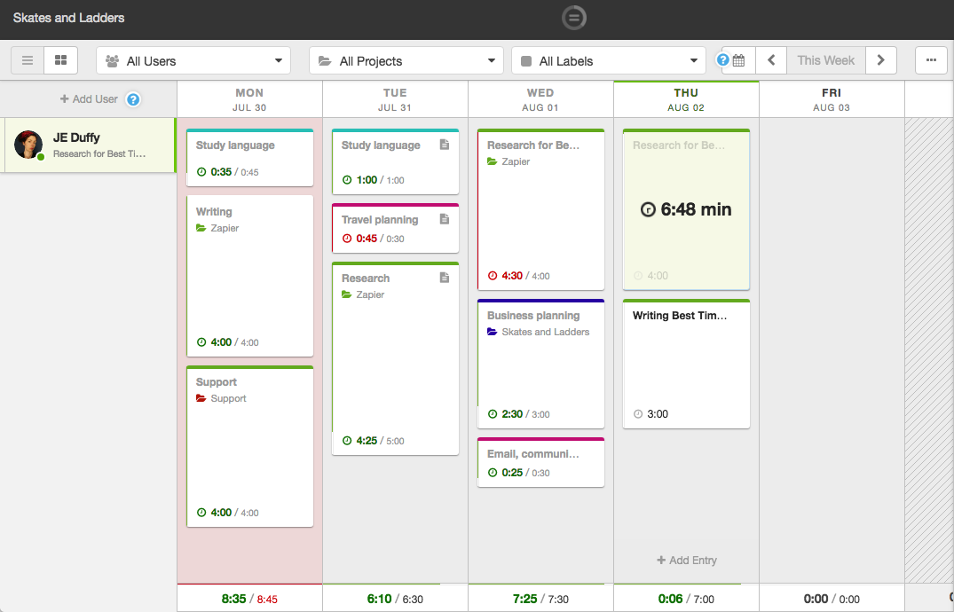 HourStack 은 다른 많은 시간 추적 앱과 다르게 보이는 협업 시간 추적 도구입니다. 작업 시간이 캘린더의 이벤트인 것처럼 블록이나 창으로 시간을 나타냅니다. 이 방식으로 시간을 배치하는 유일한 앱은 아니지만(Timeneye도 마찬가지입니다), 다른 앱과 비교하여 작업을 시작하기 전에 시간을 계획하는 데 더 중점을 둡니다. 예를 들어, 주 후반에 작업하려는 작업에 대해 일정에 시간 블록을 할당할 수 있습니다. 작업에 1시간이 소요될 것이라고 생각하거나 한 시간 이상을 사용하지 않으려는 것을 나타낼 수 있습니다. 타이머를 시작하면 HourStack은 사용자가 설정한 기대치 내에서 유지하도록 도와줄 시계를 계속 주시합니다.