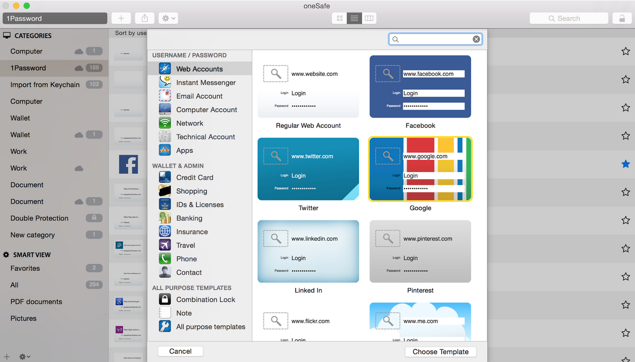 템플릿은 신용 카드, 웹 프로필 및 포인트 카드를 입력하는 데 사용되므로 읽기 쉽습니다. 또한 oneSafe의 검색을 통해 저장된 파일을 쉽게 찾을 수 있습니다.