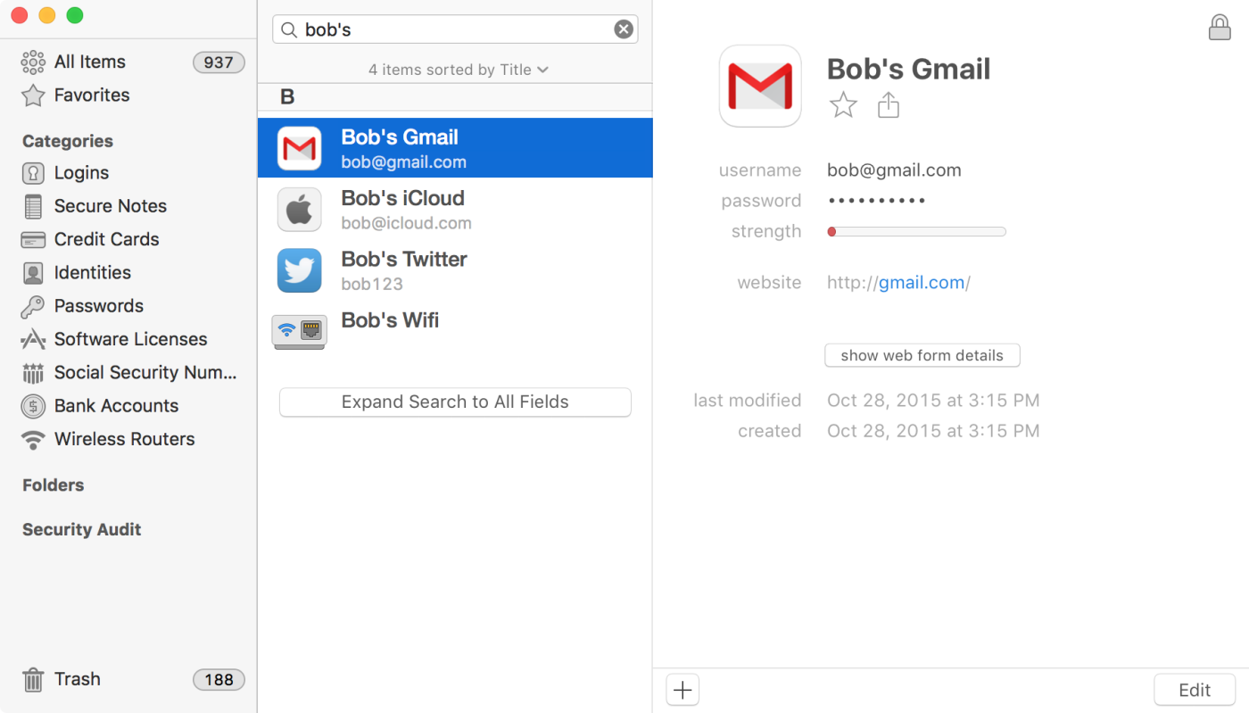 1Password 는 가장 인기 있는 비밀번호 앱 중 하나이며 온라인과 오프라인 모두에서 작동합니다. Wi-Fi, iCloud 또는 Dropbox를 통해 장치 간에 암호를 동기화할 수 있습니다.