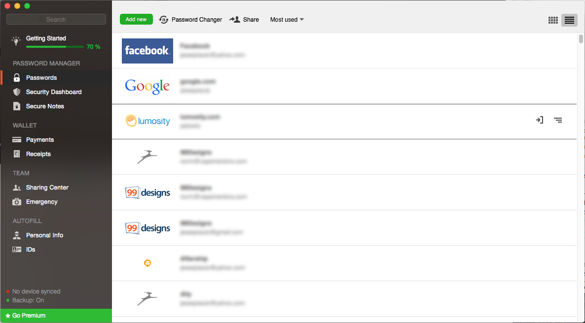 LastPass의 프리미엄 버전을 선택하면 원하는 만큼 많은 장치 간에 암호를 동기화할 수 있습니다. 모바일 앱을 사용하면 비밀번호를 복사하여 앱이나 웹 브라우저에 붙여넣을 수 있습니다. iPhone 사용자인 경우 마스터 암호 대신 Touch ID를 사용하여 암호 보관소에 접근할 수 있습니다.