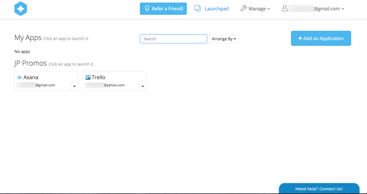 조직의 홈 화면을 "런치패드"라고 합니다. 사용하기 쉬운 하나의 인터페이스에 있는 공유 회사 계정 목록입니다. 공유 앱 중 하나를 클릭하면 Meldium이 다른 브라우저 탭에서 자격 증명을 자동으로 채웁니다. 팀원 누구나 필요한 앱을 빠르게 열 수 있습니다.