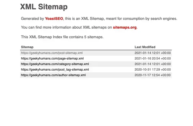 설명하자면 사이트맵은 블로그 게시물의 모든 메타데이터를 저장하는 XML 페이지입니다. 게시된 기사의 URL, 마지막으로 수정한 시간, 이미지 수와 같은 데이터를 저장합니다.