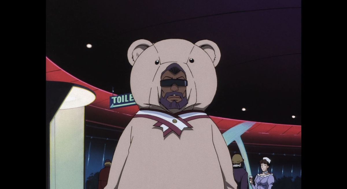거대한 테디베어 마스크와 웃는 얼굴의 폭탄 기폭 장치를 가진 남자는 카우보이 비밥 22화에 대한 암시입니다., "카우보이 펑크." 에피소드는 스파이크와 함께 "Teddy Bomber"라는 가명을 사용하는 반자본주의 테러리스트 테드 바워(Ted Bower)에 관한 이야기로 시작됩니다. 현상금 사냥꾼, 흰 종마 등 모든 것이 되는 "카우보이" 비트에 완전히 헌신하는 부자, 오아피쉬, 완고하게 자기 중심적인 현상금 사냥꾼. Andy는 Spike를 Teddy Bomber와 혼동하여 실제 Teddy Bomber의 현상금을 모으기 위해 계속 노력하면서 둘 사이에 에피소드에 걸친 불화를 촉발합니다. 표면적으로는 에피소드의 적대자임에도 불구하고 Ted는 다소 나중에 생각하는 것으로 취급된다는 사실이 우스꽝스럽습니다.
