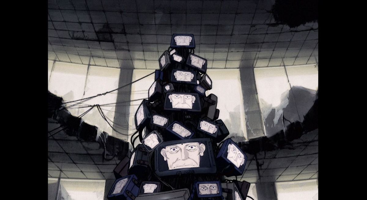 백남준 미술 전시회 처럼 보이는 텔레비전 더미는 카우보이 비밥 의 23번째 에피소드인 "Brain Scratch"를 시각적으로 참조한 것입니다. 이 에피소드 에서 나머지 비밥 크루들에게도 알려지지 않은 페이가 종말의 시종으로 위장하게 됩니다. 사이버 컬트 스크래치. 이 그룹은 헤븐즈 게이트 설립자 Marshall "Do" Applewhite와 1983년 Videodrome 의 Dr. Brian O'Blivion 사이의 십자가로 요약되는 불길한 자조 전문가인 Dr. Londes가 이끄는 그룹 입니다. 론데스에서 현상금을 모으려는 페이의 음모에 휘말린 후, 제트와 에드가 새로운 VR 게임 헤드셋을 사용하여 론데스를 잡기 위해 론데스의 행방에 대한 단서를 추적하자 스파이크는 걸어서 페이를 구출합니다. 재미있긴 하지만 아주기묘한 에피소드, 1998년의 Serial Experiments Lain 과 같은 당시의 유사한 애니메이션과 같은 세기 전환기 기술 불안의 시대정신을 활용한 에피소드 입니다.