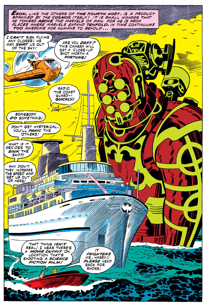 더 넓은 Marvel 우주에 대한 이 만화의 주요 공헌은 아마도 이터널스를 만든 거대한 인간형 우주 신인 Celestials일 것입니다. 그는 Kirby 시리즈에서 행성이 파괴로부터 구원받을 가치가 있는지 판단하기 위해 지구로 돌아왔습니다. Celestials는 우주 창공의 일부가 되었으며, 최근 Avengers 스토리라인에서 팀이 속이 비어 있는 Celestial 시체를 새 본부로 바꾸는 것으로 끝맺었습니다.