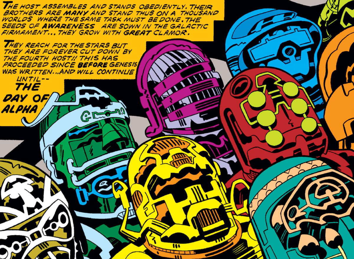 The Eternals 와 함께 Kirby는 다시 신화와 공상 과학을 혼합하여 전체 Marvel Universe 또는 최소한 해당 버전의 Earth에 대한 기원 이야기를 만들었습니다. 수백만 년 전, Celestials로 알려진 거대한 존재가 우주에서 내려와 지구의 호미니드 개체군에 대한 유전 실험을 했습니다. 이것은 Marvel Universe에서 인간이 신들의 도움을 받아 유인원 조상으로부터 어떻게 진화했는지에 대한 표준입니다.