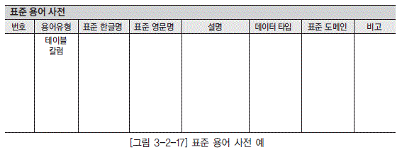 표준 용어는 전사적으로 보유하고 있는 엔터티와 속성을 대상으로 추출된 표준 단어를 조합하여 생성되며 용어 사전은 엔터티 용어 사전과 속성 용어 사전으로 구분하여 정의 관리한다. 정의된 각각 의 용어는 논리명(한글명)과 물리명(영문명)을 가지며, 용어 범위 및 자격 형식 등이 설명되어야 한 다. 표준 용어 사전은 [그림 3-2-17]과 같은 형식으로 작성할 수 있다.