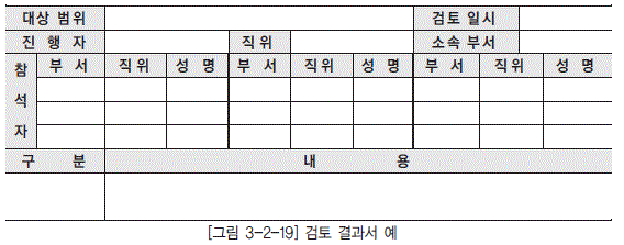 - 검토 세션이 종료되면 세션별로 그 결과를 정리한다. 검토 결과는 [그림 3-2-19]와 같은 양식에 정리한다