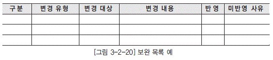 - 검토 결과가 정리되면 데이터 표준 대상별로 보완 사항을 작성한다. 보완 목록을 작성할 때는 검토 결과의 지적 사항만을 기록하는 것이 아니라 특정 내용이 변경됨으로써 함께 변경되어야 할 대상 도 함께 기록한다. 특히 표준 단어, 표준 도메인, 표준 코드에 대한 변경은 표준 용어에 영향을 미 치게 된다. 보완 목록은 [그림 3-2-20]과 같은 양식에 작성한다.