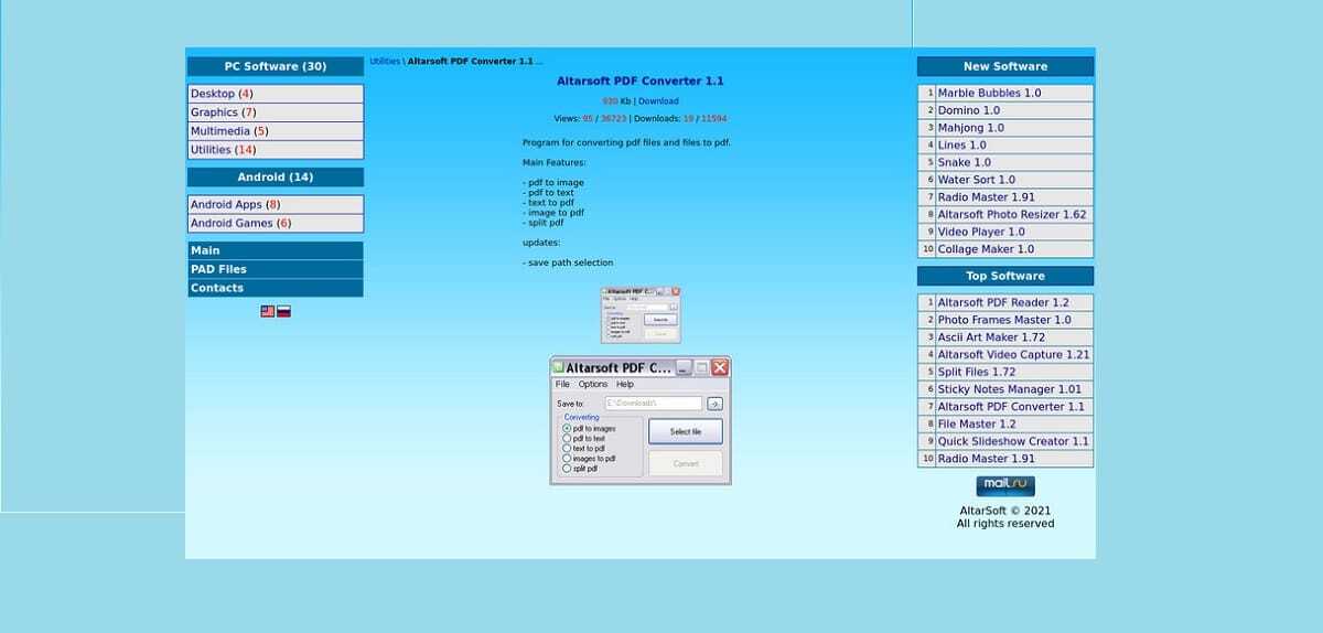 수년이 지난 간단한 소프트웨어이지만 이러한 종류의 변환기에서 기대할 수 있는 모든 작업을 수행합니다. Altarsoft PDF 변환기 특정 제한 사항이 있지만 완전 무료이며 사용하기가 매우 쉽습니다. 예를 들어 한 번에 하나의 이미지만 변환할 수 있습니다. 많은 파일로 작업해야 하는 경우에는 그다지 실용적이지 않습니다.