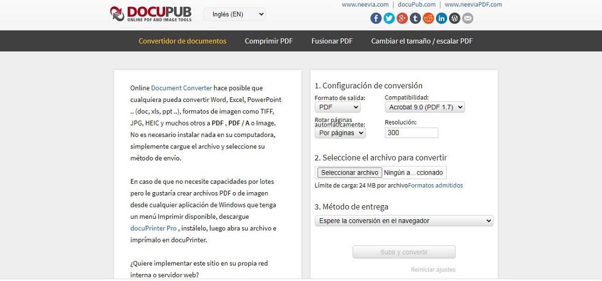 사진을 PDF로 변환하는 과정 다큐펍 정말 간단합니다. 이 페이지를 통해 PNG 및 JPEG 형식의 이미지를 24단계로 PDF로 변환할 수 있습니다. 먼저 호환되기를 원하는 Acrobat 버전을 선택한 다음 파일에서 파일을 찾습니다(최대 XNUMXMB ) 마지막으로 배송 방법을 선택합니다.