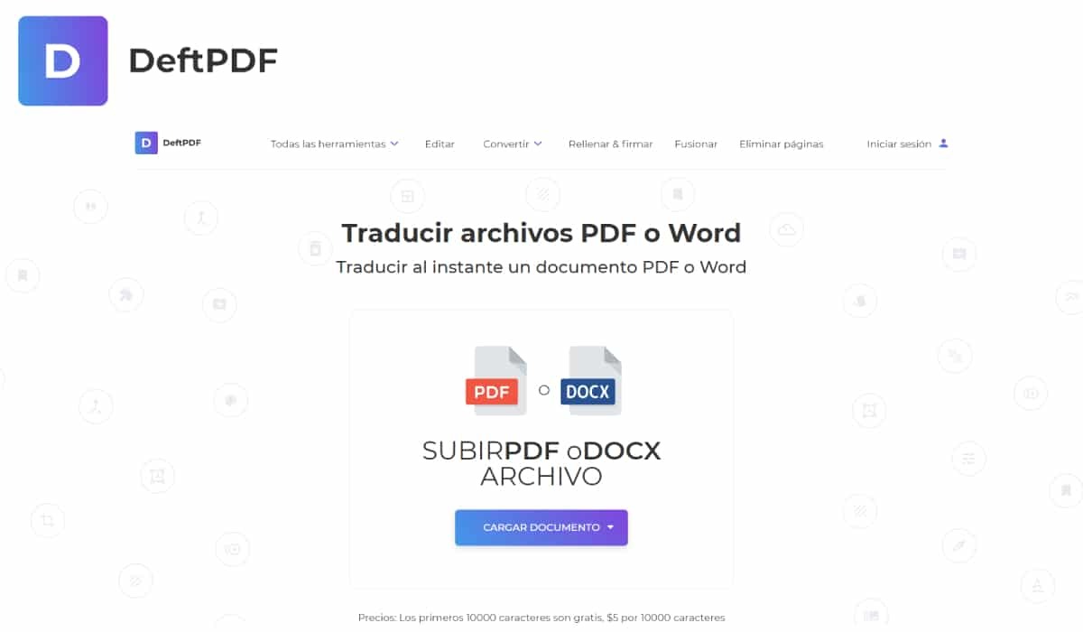 DeftPDF에서 우리는 도구를 찾습니다 매우 시각적이고 간단하고 빠르며 효과적입니다. 이 웹 사이트를 통해 PDF 또는 Word 문서를 즉시 번역 할 수 있습니다. 이렇게하려면 다음을 수행해야합니다.