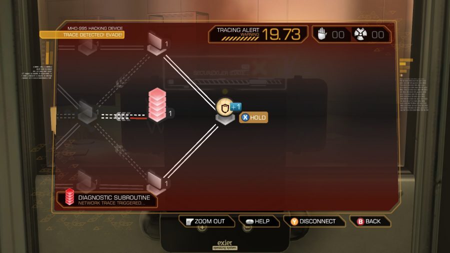 System Shock 2에서와 같이 해킹은 주인공 Adam Jensen이 점수를 매길 수 있는 기술 중 하나입니다. 인터페이스도 마찬가지로 흥미롭습니다. 플레이어는 그리드에서 노드를 캡처하여 두 지점 사이의 경로를 구축합니다. 시스템은 2016년 속편 Mankind Divided에서 대부분 변경되지 않고 돌아왔습니다.