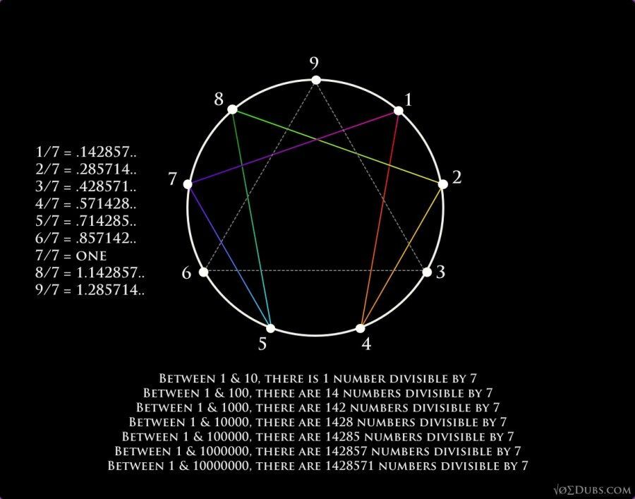 그밖에 다른 수(1~9)를 나누었을때에도 중간 142857이 무한이 반복되는 패턴이 나타나게 됩니다.