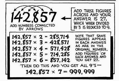 숫자 142857을 세 자리씩 나누어 더하면 ‘142+857=999’가 나오며 두 자리씩 나누어 더해도 ‘14+28+57 = 99’가 나옵니다.