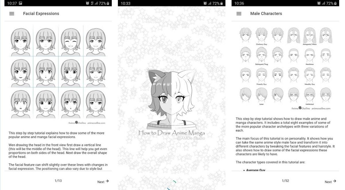 응용 프로그램 그리기 애니메이션 단계적으로 우리에게 제공합니다 애니메이션 그리는 법을 배우는 간단한 방법, 우리 자신의 속도와 우리 자신. 이 응용 프로그램은 얼굴에서 머리카락에 이르기까지 신체의 다른 부분을 그리는 다양한 자습서를 제공합니다. 또한 창작물을 채색 할 때 고려해야 할 일본 드로잉 전문가의 팁을 제공합니다.
