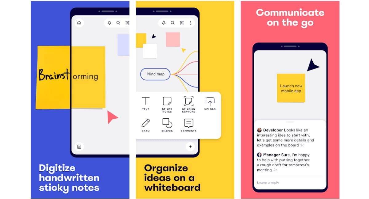 Android 애플리케이션을 사용하면 디지털 메모로 변환 할 수있는 스티커 메모를 추가하고, 아이디어를 즉석에서 캡처하고, 만든 보드를 공유하고, 공동 작업을 위해 다른 구성원을 초대 그들과 함께 다른 팀 구성원이 추가 한 주석을 추가 및 / 또는 검토합니다.