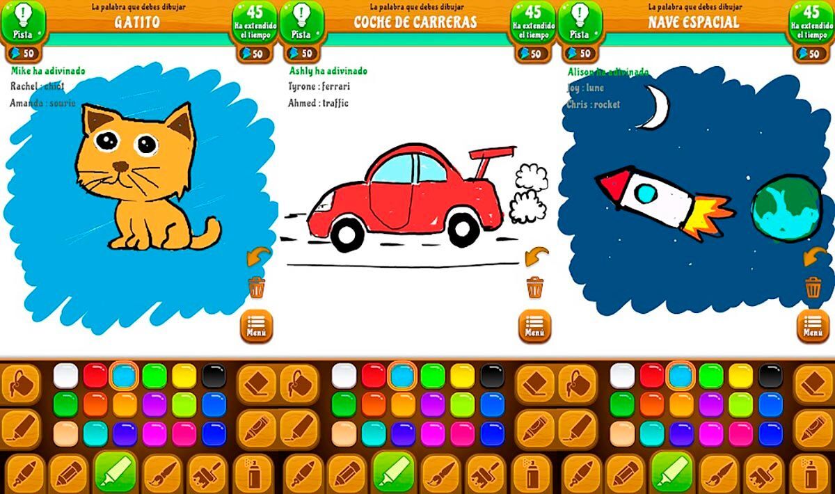 이 게임에는 폭탄이라는 간단하고 재미있는 메커니즘이 있습니다. 막혀서 닿는 단어 나 문자를 추측 할 수 없을 때 폭탄을 사용하여 잘못된 문자를 제거 할 수 있습니다. 이 외에도 당신은 완벽하게 그리는 매우 완벽한 컬러 팩, 무지개의 모든 색깔. 그리고 우리 의견으로는 pinturillo 유형 게임의 경우 더 재미 있고 후자가 제공하지 않는 것은 무엇입니까? 매일 도전 당신의 능력을 보여주기 위해.
