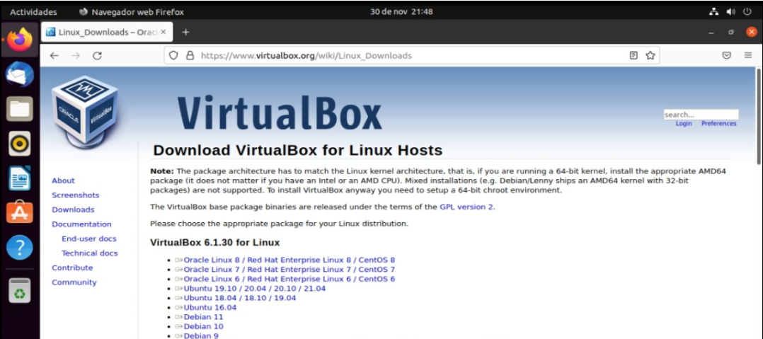 이 두 번째 방법에 대해 설명하려면 Virtual Box Downloads의 Linux 섹션으로 이동하여 ".deb 형식" 의 설치 프로그램을 낮추어야 합니다 . 사용 가능한 버전이어야 하며 "Ubuntu" 버전에 해당해야 합니다 . 예를 들어 Ubuntu 19.10/20.04/20.10/21.04 용 설치 프로그램을 다운로드하려면 여기를 누르기 만 하면 됩니다 .