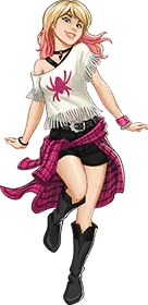 그웬은 방사능 거미에게 물려 거미와 같은 힘을 얻었다. 그녀는 어머니로부터 물려받은 자유 정신과 아버지 경호원의 엄격한 원칙 사이에서 종종 고립되고 갈등을 느꼈습니다. 그웬은 메리 제인 왓슨 "The Emm-Jays"와 공동 설립한 록 밴드를 통해 자신의 목소리를 찾았고 가면을 통해 더 많은 자유를 찾았고 빠르게 인기 있는 뉴스 기사이자 현명한 연주자가 되었습니다. 아버지의 도덕률에 영향을 받은 그웬은 친구인 피터 파커와 같은 도움이 필요한 사람들을 돕기 위해 자신의 힘을 사용합니다.