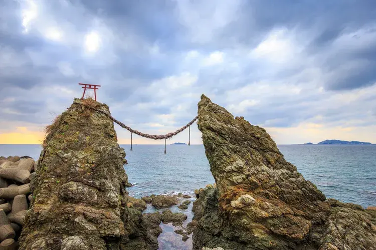 노모자키 메오토이와는 나가사키시 남부에 위치한 아름다운 '커플 바위'이자, 인기 있는 파워 스폿이자, 행복한 결혼 생활의 상징으로 여겨집니다. 나가사키의 이 숨겨진 명소에서는 해안에서 볼 수 있는 두 바위 사이로 지는 석양의 숨 막히는 광경이 특징입니다. 맑은 날에는 멀리 군칸지마도 보입니다.
