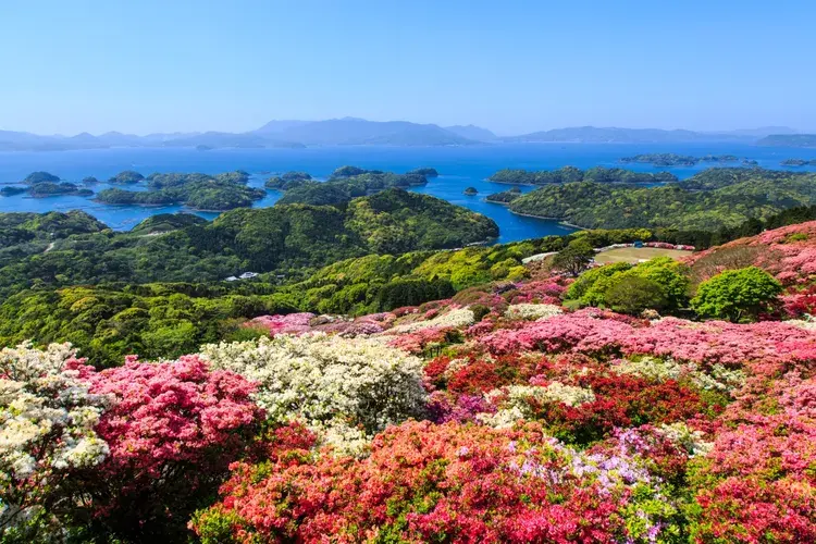 사이카이 국립공원 내에 위치한 구주쿠시마에는 수십 개의 아름다운 자연경관, 들쭉날쭉한 해안, 독특한 섬이 있습니다. 사세보시 앞바다에서 25km 떨어진 바다에 총 208개의 섬이 점재해 있는 이 경승지의 이름('99개의 섬'으로 번역)은 이 지역이 일본에서 섬 밀도가 가장 높다는 것을 보여줍니다.