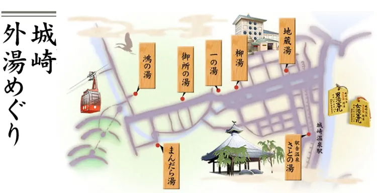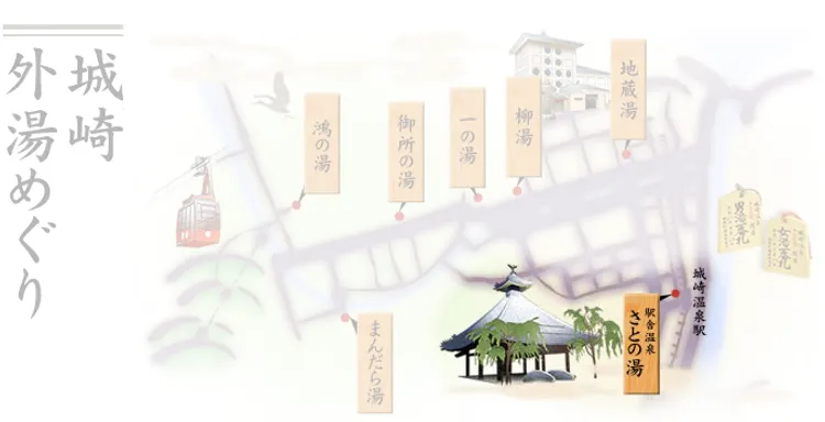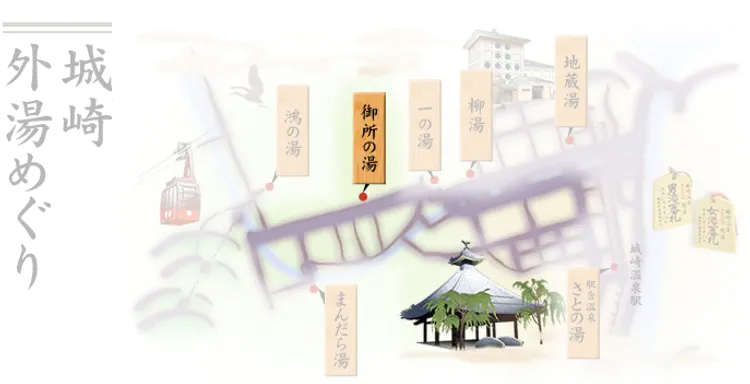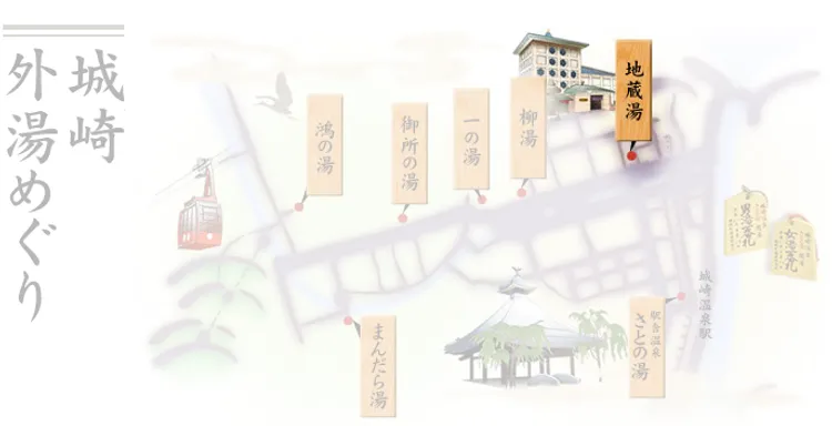 보통 온천 시설은 온천 원천이 있고 각 호텔이나 료칸에서 그 물을 끌어와서 개별 욕실이나 단체 욕탕에서 사용합니다. 그런데 기노사키 온천에서는 호텔이나 료칸에서 온천욕을 하기가 어렵습니다. 온천 마을 전체가 협의해서 커다란 온천시설 7곳에서만 온천욕을 할 수 있도록 했기 때문인데요, 그 덕에 기노사키 온천만의 독특한 문화인 소토유 메구리가 생겨났습니다.