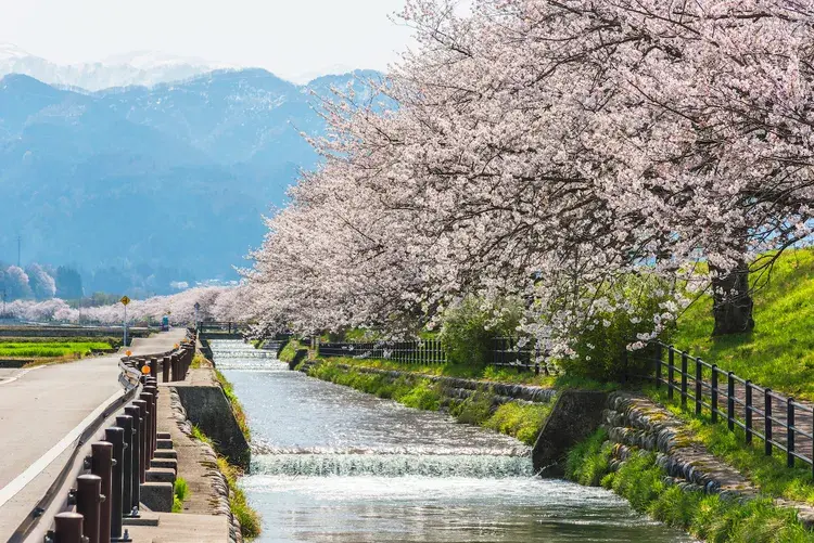 물이 많고 맑기로 유명한 구로베강에서는 그 선상지의 물이 샘솟는 곳들이 '전국 명수 백선'에 선정되었습니다. 마을 사람들이 합심하여 제방 옆에 심은 70그루의 왕벚나무는 50여 년의 시간을 거쳐 170그루로 늘어나 1.2km나 이어지는 벚꽃길이 되었습니다. 다테야마 연봉의 장관과 강의 핑크빛 아치가 절묘하게 조화됩니다. 맑게 갠 하늘 아래 상쾌한 들녘 풍경과 벚나무, 가까이에서 들리는 졸졸 흐르는 물소리, 연분홍 커튼의 전경은, 마치 시나 회화 같은 환상적 풍경으로 매년 많은 사람을 매료시키고 있습니다.