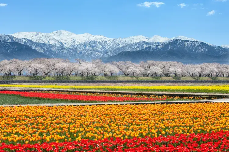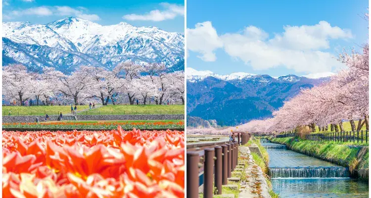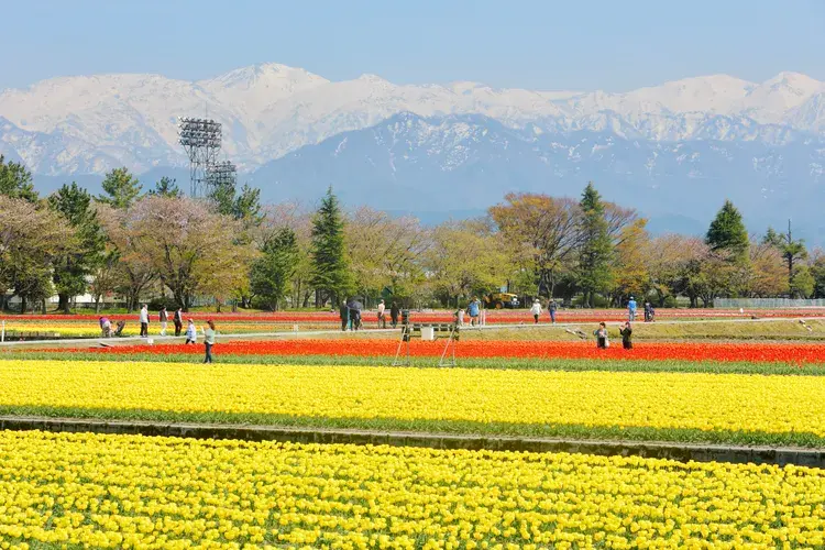 같은 시기에 60만 송이에 이르는 화려한 튤립, 황금빛 유채꽃이 만발하여 바다를 이룹니다. 잔설이 남아 있는 아사히다케, 시로우마다케 등 북알프스 연봉을 배경으로, 벚꽃의 '핑크', 튤립의 '빨강', 유채꽃의 '노랑'과 산의 '흰색'이 협연하는 '봄의 사중주'를 매년 4월 초순부터 중순경까지 감상할 수 있습니다. 이벤트 기간에는 아이노카제 도야마 철도선 '도마리역' 등에서 관람객을 위한 임시 버스가 운행됩니다.