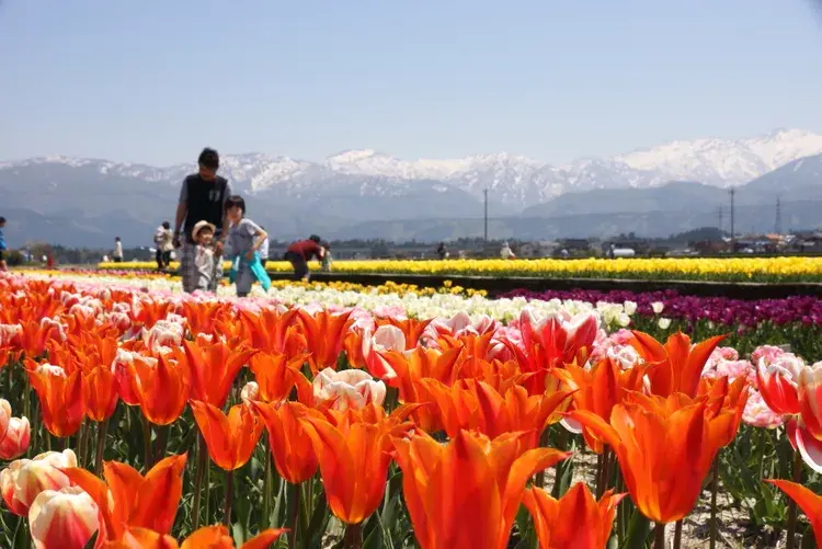 튤립은 뉴젠의 명물이라고 해도 과언이 아닙니다. 뉴젠마치에서는 일본 최대 규모를 자랑하는 튤립 행사가 열립니다. 1991년에 시작되어 2021년에 25년째를 맞은 '뉴젠 플라워로드'는 현지에서 매년 개최되는 성대한 행사입니다. 맑은 하늘과 잔설이 남아있는 북알프스를 배경으로, 약 8ha의 꽃밭에 100종, 300만 송이의 튤립이 일제히 개화하면 빨강, 노랑, 오렌지, 핑크 등 눈부신 꽃의 융단이 펼쳐집니다.