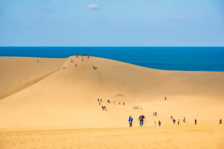 돗토리현 산인카이간 국립공원에서 2km 넘게 뻗어 있는 일본에서 가장 인상적인 사구 중 하나입니다. 잔물결치는 모래가 끊임없이 움직이며 바다 위를 내려다보는 신비로운 풍경을 만들어냅니다. 낙타나 말이 끄는 수레를 타고 사구를 둘러볼 수 있고, 모험을 좋아하신다면 샌드보딩과 패러글라이딩도 즐길 수 있습니다.