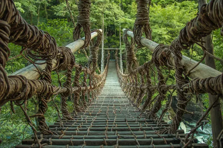 도쿠시마현 이야 계곡에서는 수정처럼 맑은 강 위에 덩굴로 만든 다리가 놓여 있는 독특한 광경을 볼 수 있습니다. 자연 그대로의 황무지에 둘러싸여 있는 다리는 주변 풍경과 더해져 장관을 이루며, 관광객들을 끌어모읍니다. 원래 이곳에는 13개의 다리가 있었는데, 현재는 3개의 다리만 남아 있는데, 안전을 위해 정기적으로 관리되고 있다 합니다. 다리의 기원은 불분명하지만, 고보 다이시가 일본을 여행하면서 건설했다고 믿는 사람이 많습니다. 전쟁에서 패배하고 도망치던 헤이케 병사들이 만들었다는 설도 있습니다.