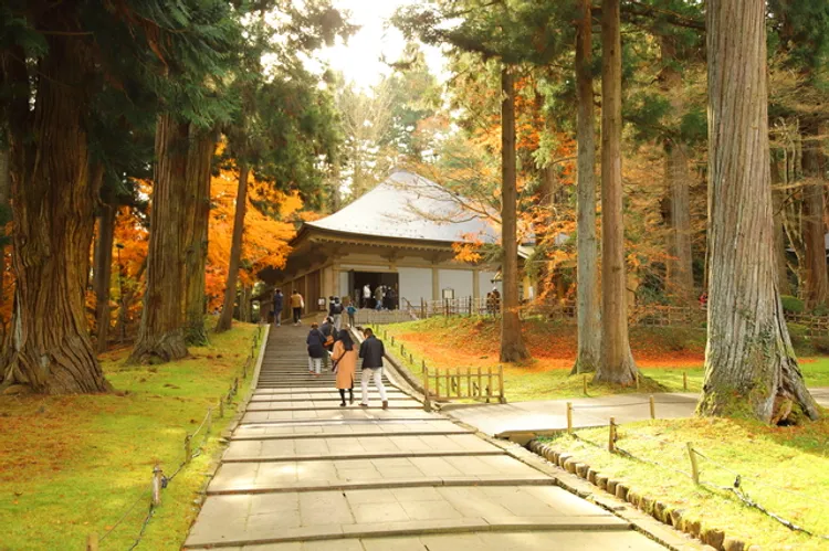 야마데라(산의 사찰)로 잘 알려진 릿샤쿠지의 놀라운 사찰 부지는 야마가타현 동쪽에 있는 호슈산의 경사면에 산재해 있습니다. 1,015개의 돌계단을 한 시간 정도 걸어 바위산 중턱에 올라가면 사찰의 하부 구조물을 지나 장관을 이루는 오쿠노인 사원과 다이부쓰덴 사원으로 갈 수 있습니다. 이곳에서는 주변 산의 멋진 경치를 감상하며 성지의 영성을 느끼고 기를 받아 갈 수도 있습니다. 계곡과 산이 단풍으로 물드는 가을이 특히 아름답습니다.