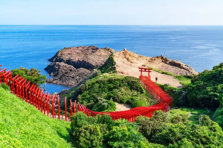 야마구치현의 들쭉날쭉한 해안선을 따라 123개의 밝은 빨간색 도리이가 즐비한 놀라운 광경은 모토노스미 신사에서 체험할 수 있는 하이라이트 중 하나입니다. 신사에 가서 새전함에 동전을 던지는 전통은 첫 번째 도리이 문 위에 높게 놓여있는 것에서 유래되었습니다. 새전함에 동전을 던져 넣어서 성공한 신사 참배객들에게는 행운이 찾아온다고 합니다.