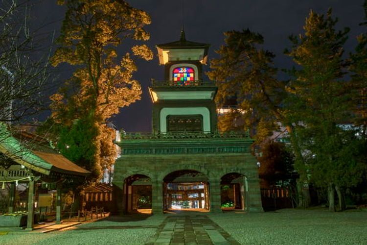 16세기 주요 장군 중 한 명이자 가가의 영주였던 마에다 도시이에를 모시고 있는 신사입니다. 다른 일본 신사들과는 달리 일본, 중국, 서양 건축의 독특한 조화를 특징으로 합니다.