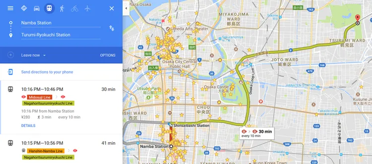 미도스지선 우메다역-신사이바시역-나가호리츠루미료쿠치선 환승-쓰루미료쿠치역