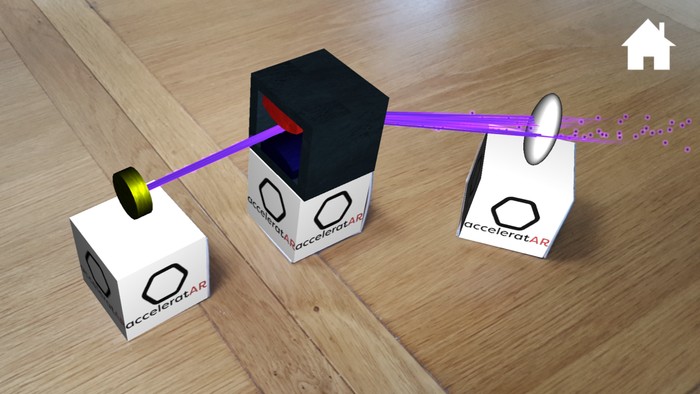큐브를 평평한 표면(각 큐브는 입자 소스 및 전기장과 같은 가속기의 다른 구성 요소를 나타냄)에 배치한 다음 함께 제공되는 앱을 사용하여 화면에 생기를 불어넣습니다.