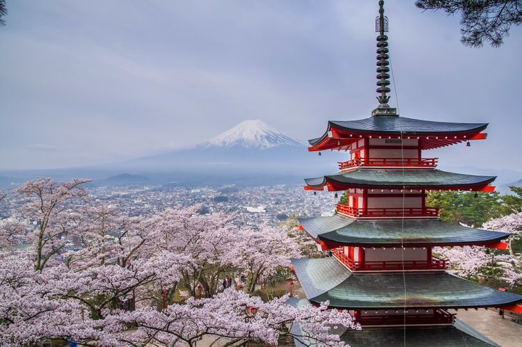 후지산은 야마나시 현과 시즈오카 현의 경계에 크게 솟아 있습니다. 야마나시 현에 있는 후지요시다시의 아라쿠라야마 센겐 공원에서 후지산의 절경을 즐길 수 있습니다. 공원에는 붉은색과 녹색으로 칠해진 5층 목탑인 ‘츄레이토 탑’이 있습니다. 순백색의 후지산과 나란히 선 츄레이토 탑을 함께 촬영하면 전형적인 일본의 모습을 사진으로 남길 수 있습니다. 4월 초가 되면 일대에 벚꽃이 만개해서 전경이 더욱 화려해지니, 4월에 방문하기를 추천합니다.