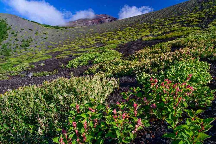 일본 최고봉임과 동시에 전 세계를 통틀어도 좀처럼 볼 수 없는 단일봉 형태를 띤 후지산에는 수직 분포라 불리는 후지산 고유의 생태계가 존재합니다. 동물로는 일본산양(천연기념물)・잣까마귀(사진 참조)가 있고 식물로는 온타데・만병초・바위장대 등이 있으며, 높이에 따라 제각기 다른 자연의 모습을 만나볼 수 있습니다. 각 고고메 등산로 입구부터 삼림 한계선에 이르기까지 산기슭에서는 좀처럼 볼 수 없는 다양한 동식물을 관찰해 보세요.
