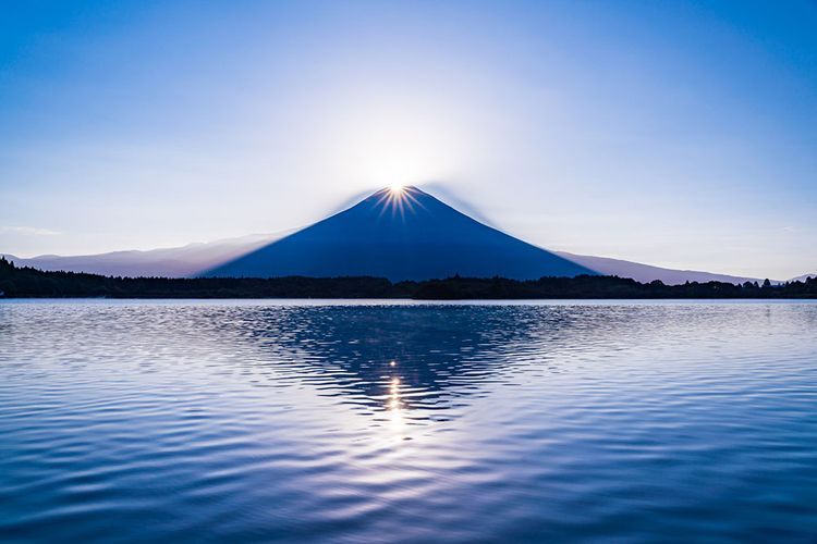 태양이 떠오를 때, 또는 질 때 후지산 정상과 태양이 겹쳐져 마치 다이아몬드가 빛나는 것처럼 보이는 현상을 '다이아몬드 후지'라고 부릅니다. 후지산이 동쪽 또는 서쪽 방향에서 보이는 장소, 시기와 시간, 기후 등 여러 조건을 만족시키지 못하면 볼 수 없기 때문에 현지인이라도 좀처럼 목격하기 힘든 절경입니다.