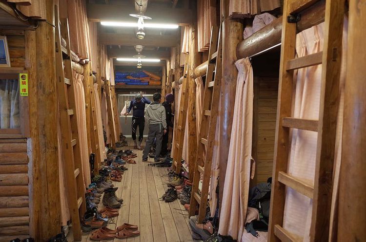후지산의 산장은 각 루트의 고고메 이상에 위치하며, 등산로 개방 기간 동안 운영됩니다. 어디까지나 휴식을 취하는 용도로만 사용되는 간이 숙박 시설이기 때문에 꼭 필요한 최소한의 설비만 갖춰져 있습니다. 숙박 요금은 1박에 식사 2회까지 포함해서 8,500엔 전후(숙박만 이용할 경우 6,000엔 전후)로, 주말에는 500엔~2,000엔 정도의 추가 요금이 부과됩니다. 혼잡할 때는 이용할 수 없는 경우도 있으니 숙박하려면 사전 예약은 필수. 예약하는 방법을 잘 모르겠다면 숙박까지 플랜에 포함된 등산 투어(영어 가이드) 이용을 추천합니다. 남녀 혼용인 산장이 대부분이며, 혼잡할 때는 한 사람이 겨우 누울 수 있는 공간밖에 확보할 수 없는 경우도 있으니 유념하세요.