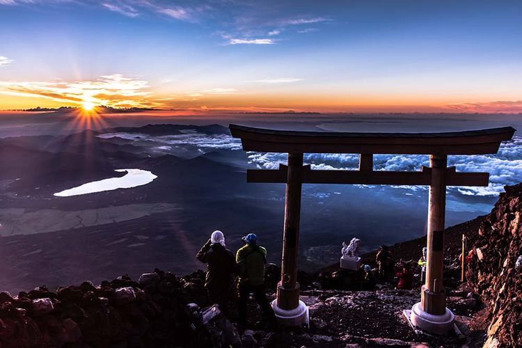 후지산 등반에 도전한다면 꼭 봐야할 것이 바로 후지산의 해돋이. 온통 어두운 하늘 속에서 서서히 솟아오르는 태양이 끝없이 펼쳐진 구름바다를 눈부시게 물들이는 광경은 숨을 죽이게 될 정도로 장관이랍니다.