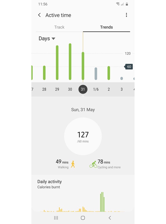 운동하는 동안 지금까지 수행한 시간에 대한 업데이트를 가끔 받게 됩니다. Auro 와 마찬가지로 앱을 Spotify 계정에 연결하여 운동하는 동안 음악을 들을 수 있습니다. 그리고 걷기를 마치면 Samsung Health 가 오늘 걸은 거리를 알려주고 오늘 소모한 칼로리를 추정하여 총 칼로리에서 활동을 통해 소모한 칼로리를 분리합니다.