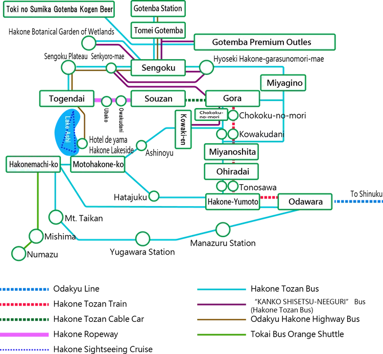 | 가격 | 이용요금[일반 패스: 유넷산 및 모리노유] 어른 (중학생 이상): 4,100 엔, 어린이 (3살부터 초등학생까지): 2,100 엔 [유넷산] 어른: 2,900 엔, 어린이: 1,600 엔 [모리노유] 어른: 1,900 엔, 어린이: 1,200 엔 *하코네 프리패스를 제시하시면 어른용 [일반 패스]를 3,800엔으로 할인해드립니다. |