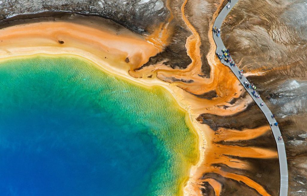 미국 와이오밍주 옐로스톤 국립공원에 있는 그랜드 프리즘 스프링(Grand Prismatic Spring)은 이 세상에서 가장 특별한 색상 팔레트를 선보입니다. 말할 필요도 없이 이곳은 미국 최고의 관광지 중 하나입니다.